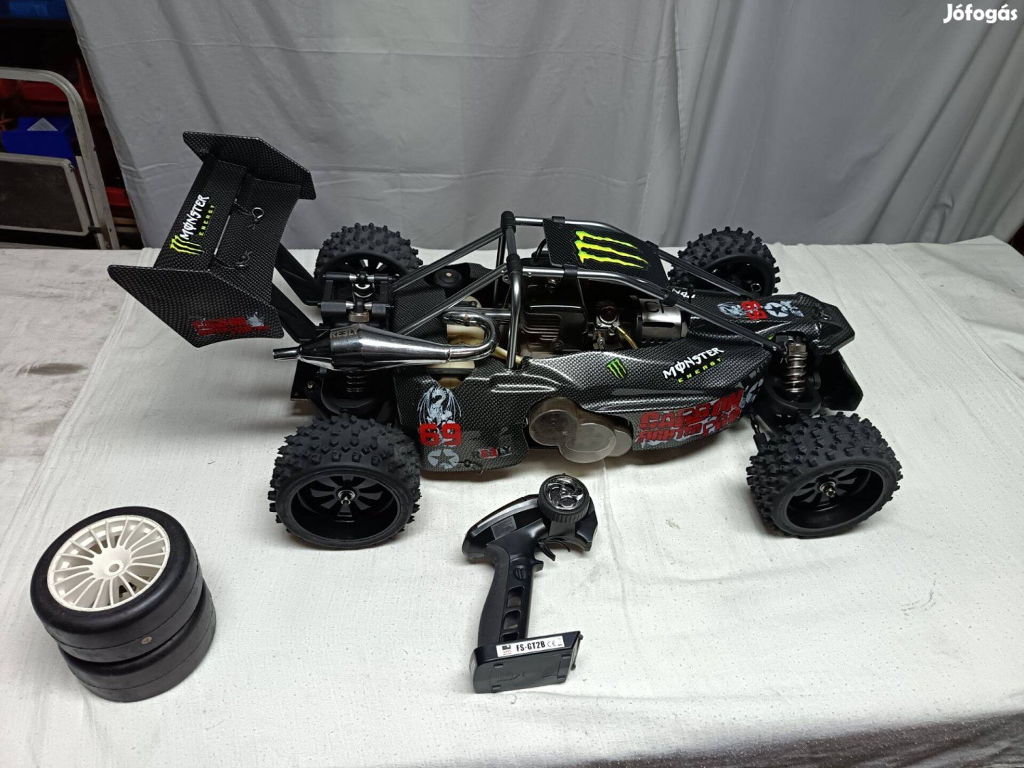 Tartozékok : üzemanyag kanna, bekevert állapotba(kB 1-2 liter) +hozzá való olaj, 2.4GHz táv beépített aksival + töltő kábellel, az autóban fesz szabályzó van a magasabb feszültségű aksihoz. 2 Db aksi ( 4-2 cellás) 7.4v. + töltő...
