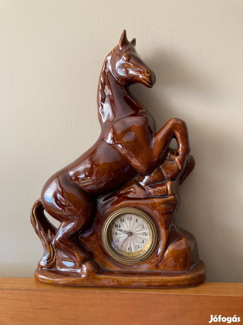 Régi art deco vekker kerámia paripa lovas asztali óra barna mázas