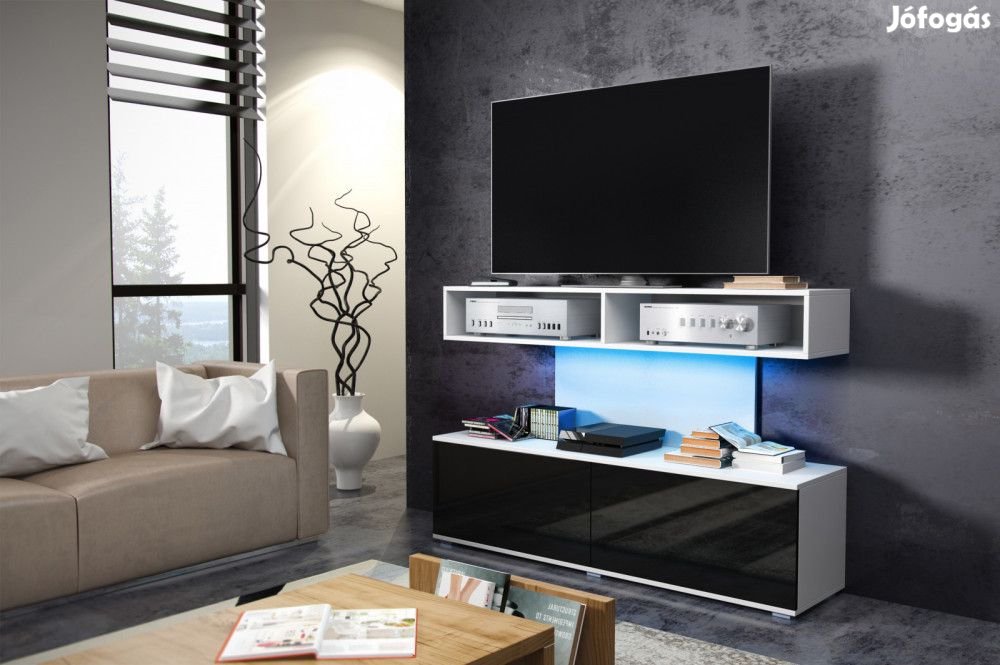 TV-állvány 2 lenyíló ajtóval és nyitott polcokkal fehér és fényes fekete színben. További információkért kattintson ide: