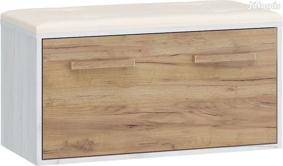 Cipősszekrény és pad egyben, lenyíló ajtós cipőtartóval és szivacs párnával, fehér tölgy és arany tölgy színben, bézs színű huzattal. További információkért kattintson ide: