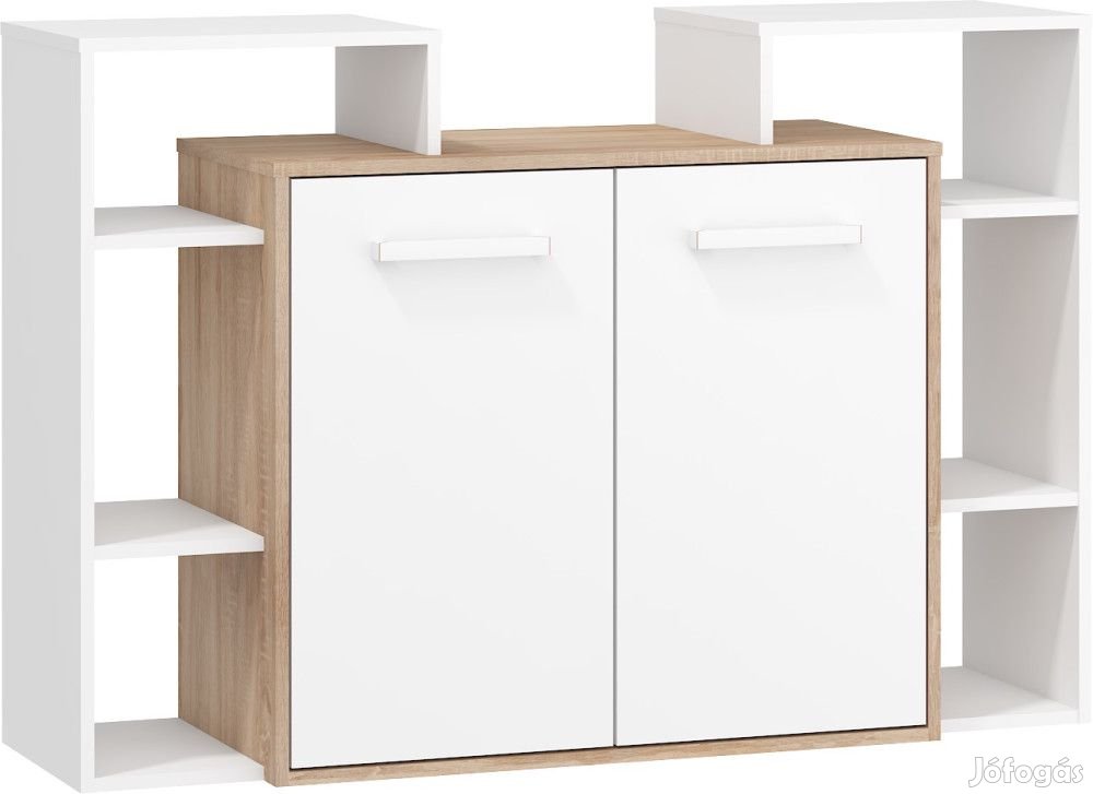Komód 2 ajtóval, az ajtók mögött polcokkal és nyitott polcokkal, világos sonoma tölgy és fehér színben. További információkért kattintson ide: