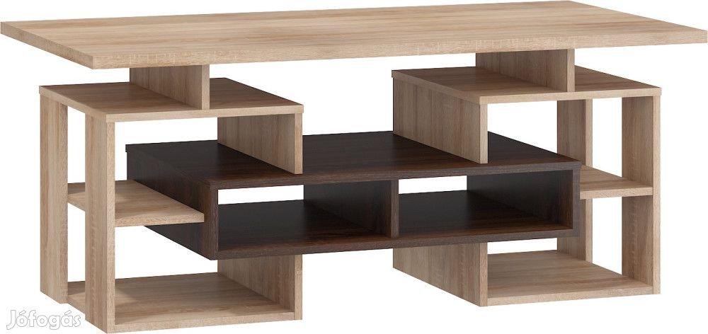 Dohányzóasztal nyitott polcokkal és téglalap alakú szögletes asztallappal, sötét sonoma tölgy és világos sonoma tölgy színben. További információkért kattintson ide: