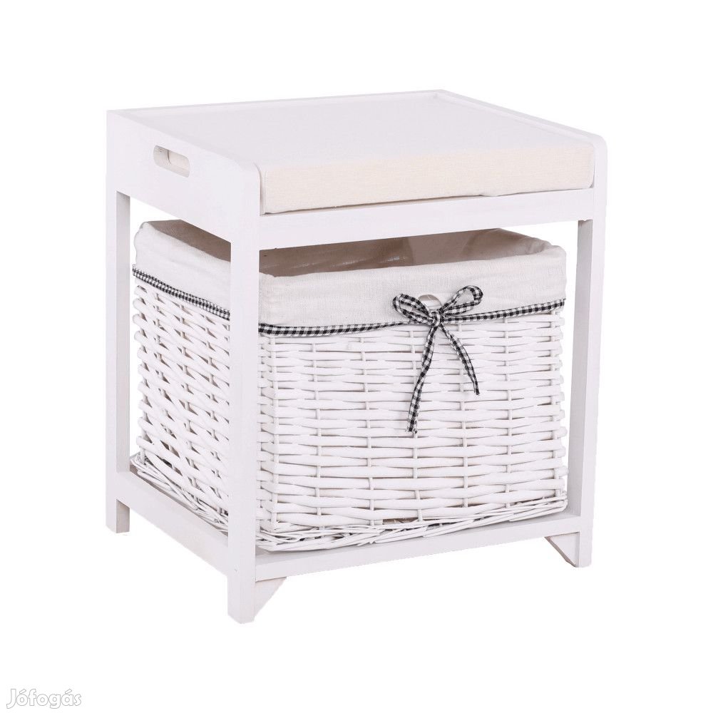 Merev keret fonott kosárral és párnával a tetején. A keret fából, a fonott kosár vesszőből készült, színük fehér.