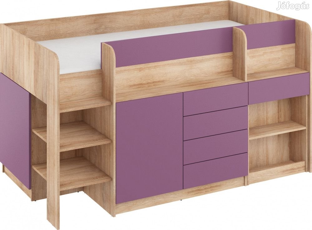 Balos, alacsony galériaágy lépcsővel, szekrényekkel, nyitott polcokkal, kihúzható íróasztallal és fiókokkal, matrac nélkül, világos sonoma tölgy és lila színben. További információkért kattintson ide: