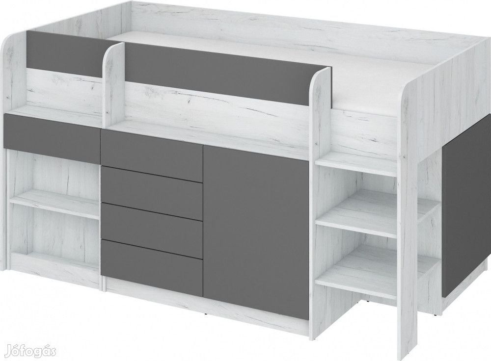 Jobbos, alacsony galériaágy lépcsővel, szekrényekkel, nyitott polcokkal, kihúzható íróasztallal és fiókokkal, matrac nélkül, fehér tölgy és szürke színben. További információkért kattintson ide: