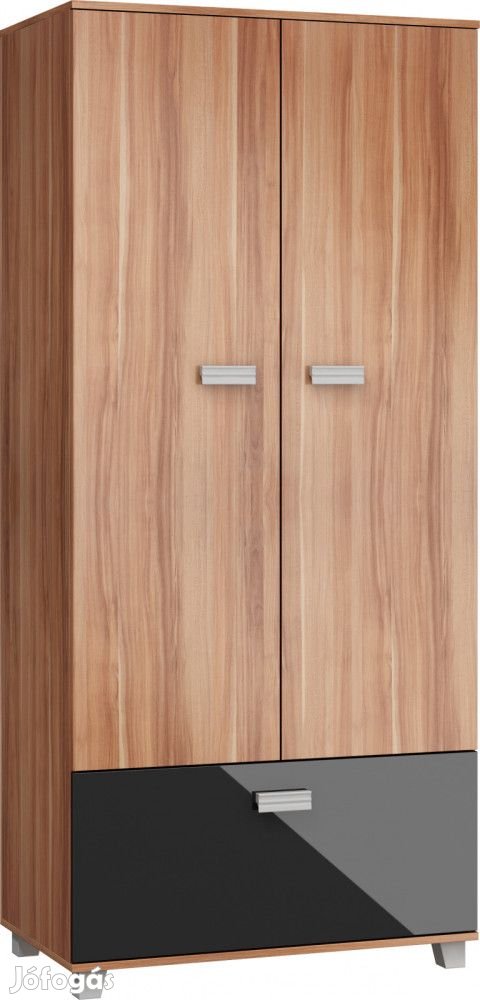 Gardróbszekrény 2 nagy ajtóval és 1 lenyíló ajtóval, a nagy ajtók mögött alul-felül 1-1 polccal és vállfatartó rúddal, szilva és fényes fekete színben. További információkért kattintson ide: