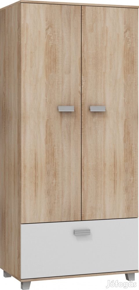 Gardróbszekrény 2 nagy ajtóval és 1 lenyíló ajtóval, a nagy ajtók mögött alul-felül 1-1 polccal és vállfatartó rúddal, világos sonoma tölgy és fényes fehér színben. További információkért kattintson ide: