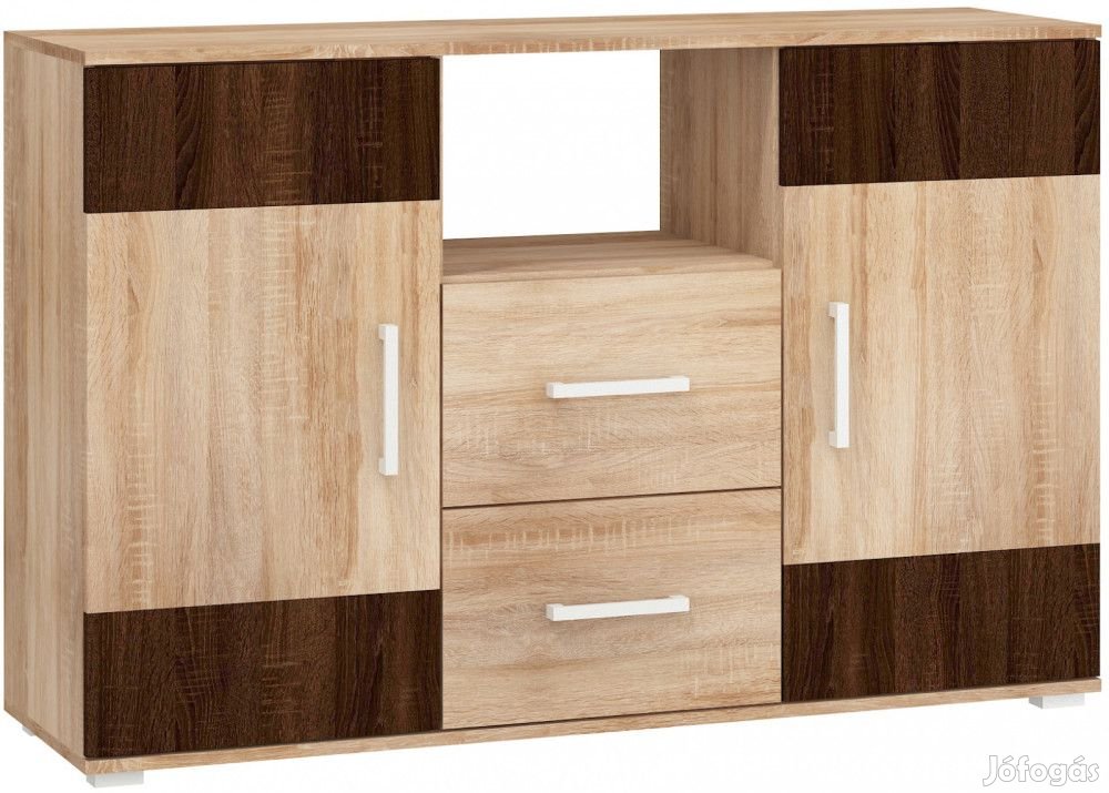 Komód 2 ajtóval, 2 fiókkal, az ajtók mögött polcokkal és nyitott polccal, világos sonoma tölgy és sötét sonoma tölgy színben. További információkért kattintson ide: