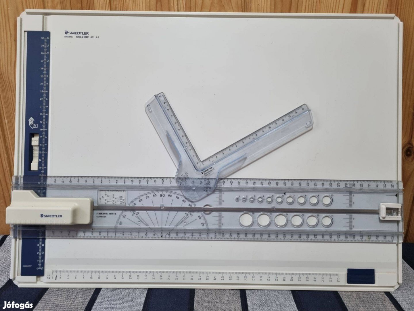 Eladó a képeken látható, jól működő, Staedtler A3 méretű rajztábla. A tábla és a vonalzó egyaránt épek, a vonalzó jól illeszkedik a rajztáblához.