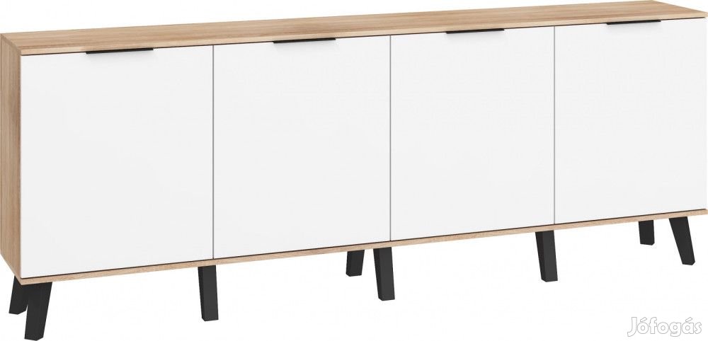Komód 4 ajtóval, az ajtók mögött polcokkal, világos sonoma tölgy és fényes fehér színben. További információkért kattintson ide: