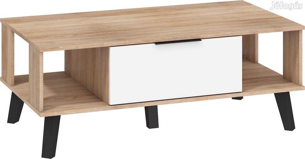 Dohányzóasztal 2 lenyíló ajtóval és nyitott polcokkal, valamint téglalap alakú szögletes asztallappal, világos sonoma tölgy és fényes fehér színben. További információkért kattintson ide: