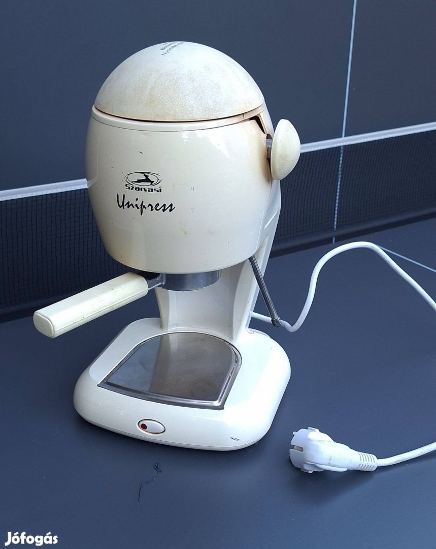 Eladó 6 személyes Szarvasi kávéfőző a képen látható állapotban javításra, vagy alkatrésznek, egyébként még működik, csak felül jön a gőz a teteje mellett. A kiöntője nincs meg , és 2 személyes őröltkávé tartója van csak meg.