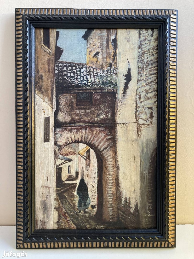 Megbízásból, XX.sz. eleji jelzetlen mediterrán utcakép csodás föld színekkel, olaj vászon technika, 32x47cm teljes méretben, kézzel megmunkált fa keretben. Egy jó ajánlatért elvihető.