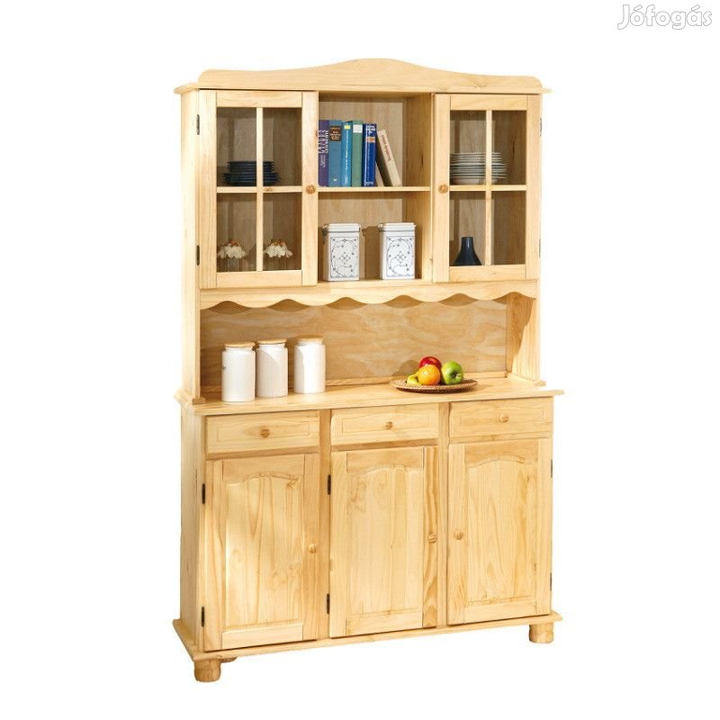 Tömör fából készült tálalószekrény 3 fiókkal, 3 tele ajtóval, 2 üveges ajtóval és polcokkal.