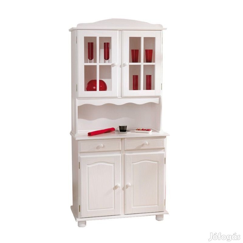 Tömör fából készült tálalószekrény 2 fiókkal, 2 tele ajtóval, 2 üveges ajtóval és polcokkal.