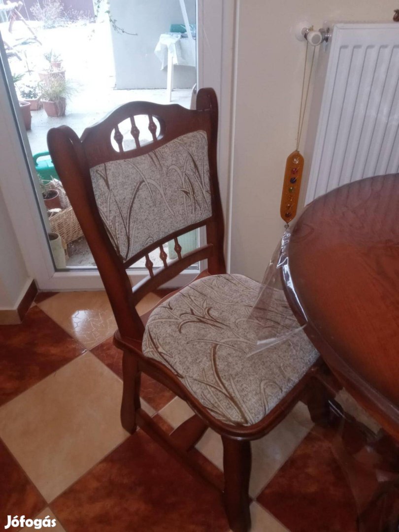 Eladásra kínálok egy szép állapotú, tömör fából készült étkezőasztalt hat székkel. Az asztal két taggal bővíthető, 8-9 személy kényelmesen elfér mellette. Színe: dió.