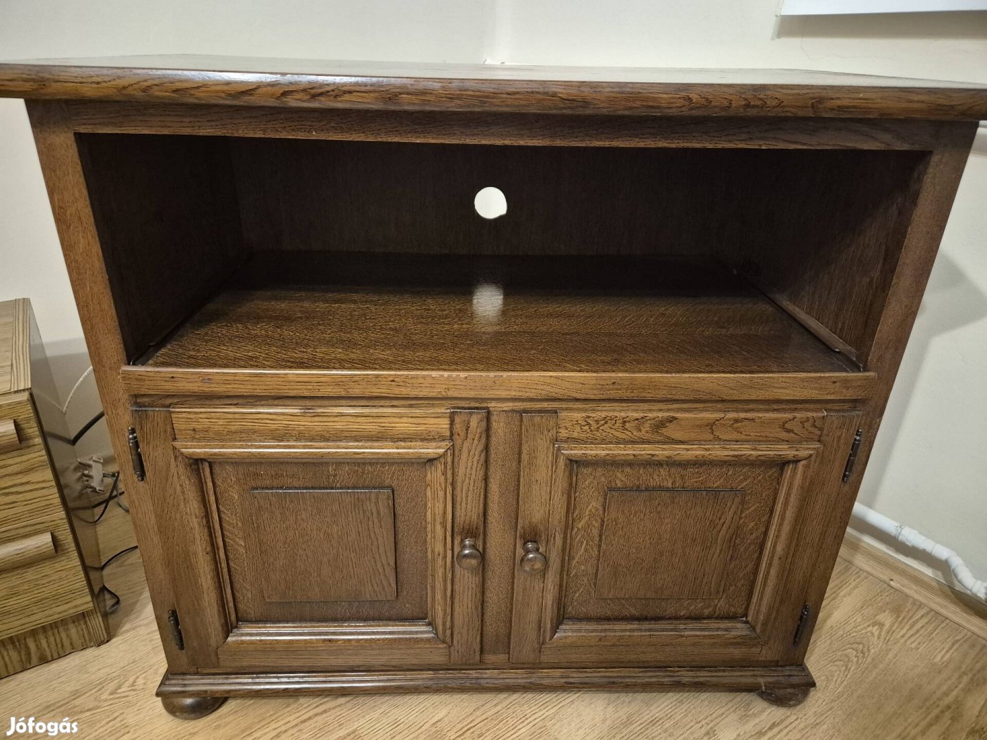 Eladó a képeken látható tv-s szekrény, alsó tárolóval és kihúzható fiókkal. A tetején fotóztam kopásnyomokat, azonkívül azonban sérülésmentes. Méretei: 85,5 x 46 cm, magassága: 74,5 cm