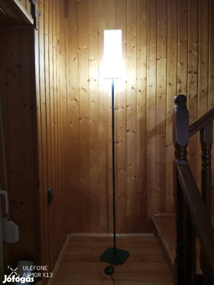 Eladó a képeken látható,alig használt,újszerű állapotban lévő,és kitűnően működő vászon búrás állólámpa,amely 1db nagy foglalatú,12W-os Smart led izzóval rendelkezik.Az állólámpa méretei:a lámpatalp négyzetes alapja:20cm széles és 20cm hosszú,a búra:12cm széles és 12cm mély,a lámpa talpától mért legnagyobb magasság a búra tetejéig:170cm.