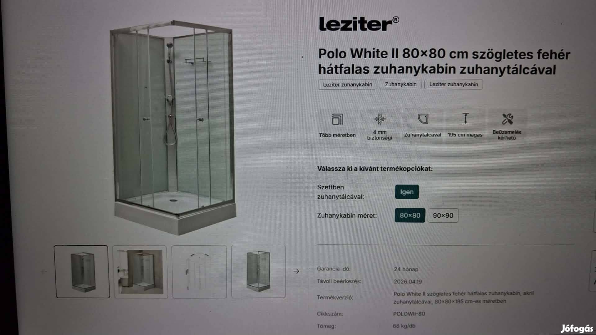 A képen látható Leziter márkájú Polo white II 80x80cm-es Szögletes Fehér hátfalas zuhanykabin akrill zuhanytálcával, szifonnal együtt alig használt állapotban eladó.