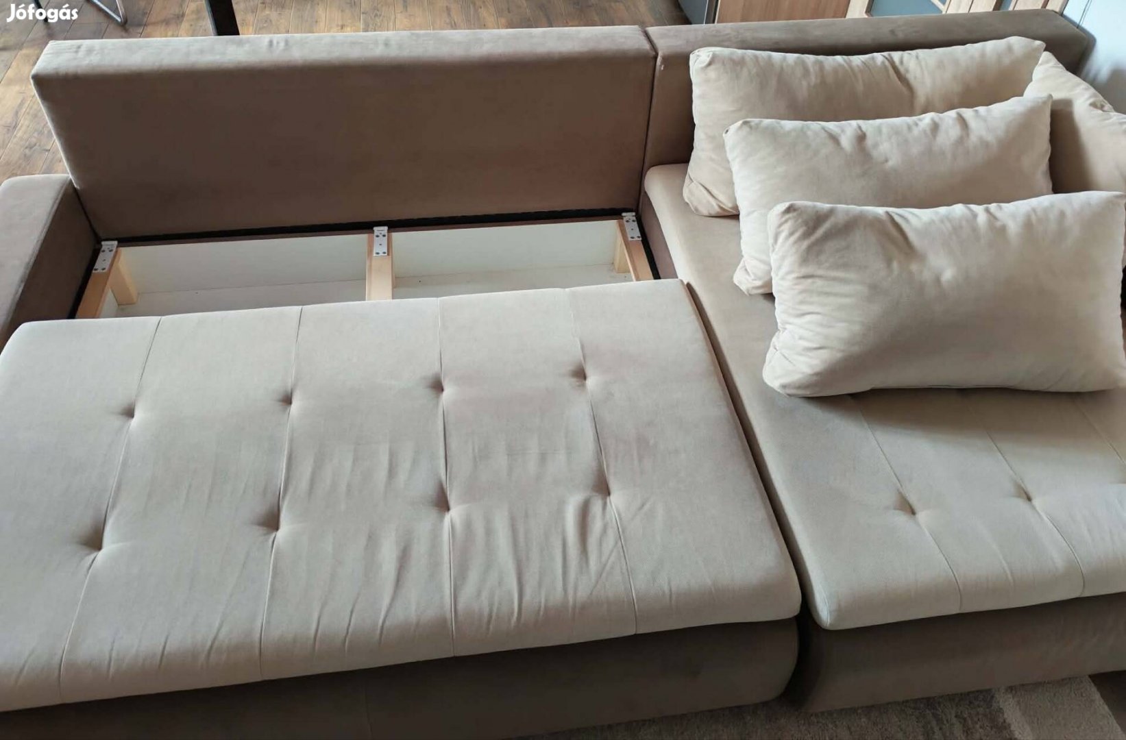 Eladó a képeken látható Vamosi Milano L-alakú kanapé. Ágyazható, ágynemű tartós. Egyetlen helyen sérült, ezt lefotóztuk. Méret 300x160 cm, azonnal elvihető. Szállításban nem tudok segíteni. Az ár alkuképes.