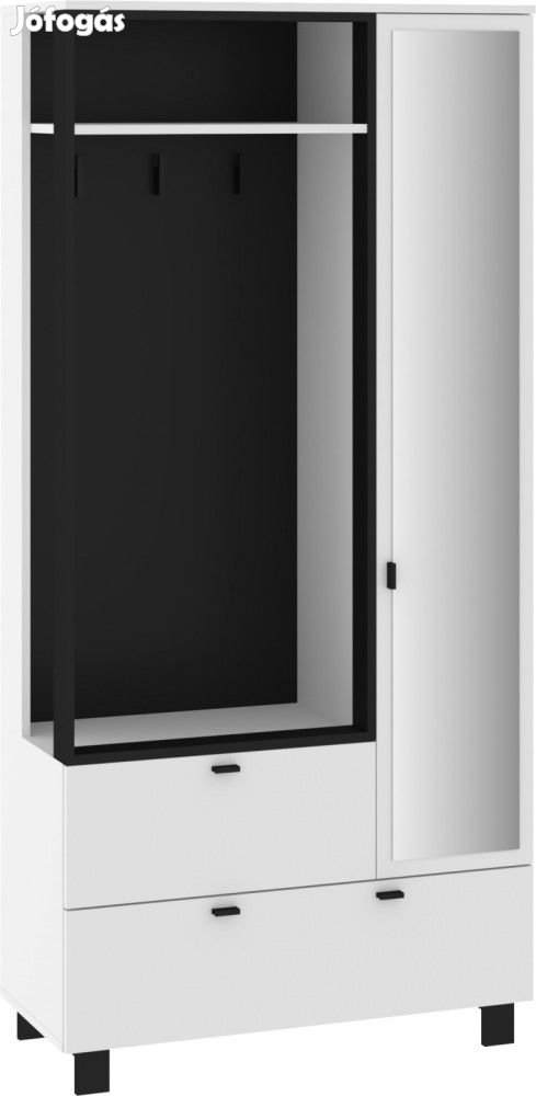 Előszoba szekrény 1-ajtós, végig polcos, magas szekrénnyel, alul lenyíló ajtóval, 1 fiókkal, ruhafogasokkal, kalaptartó polccal és tükörrel, fehér és fekete színben. További információkért kattintson ide: