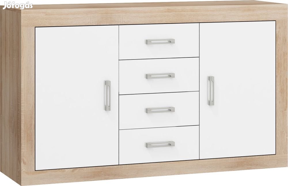 Komód 2 ajtóval, 4 fiókkal, az ajtók mögött polcokkal, világos sonoma tölgy és fényes fehér színben. További információkért kattintson ide: