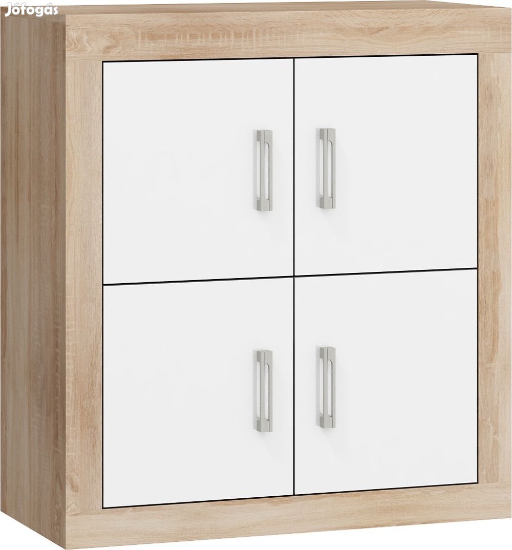 Komód 4 ajtóval, az ajtók mögött polcokkal, világos sonoma tölgy és fényes fehér színben. További információkért kattintson ide: