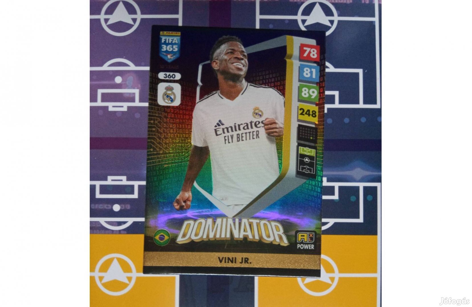 Eladó a képen látható Panini FIFA 365 Adrenalyn 2025 Vinícius Júnior (Real Madrid) 360-s sorszámú Dominator kártya.