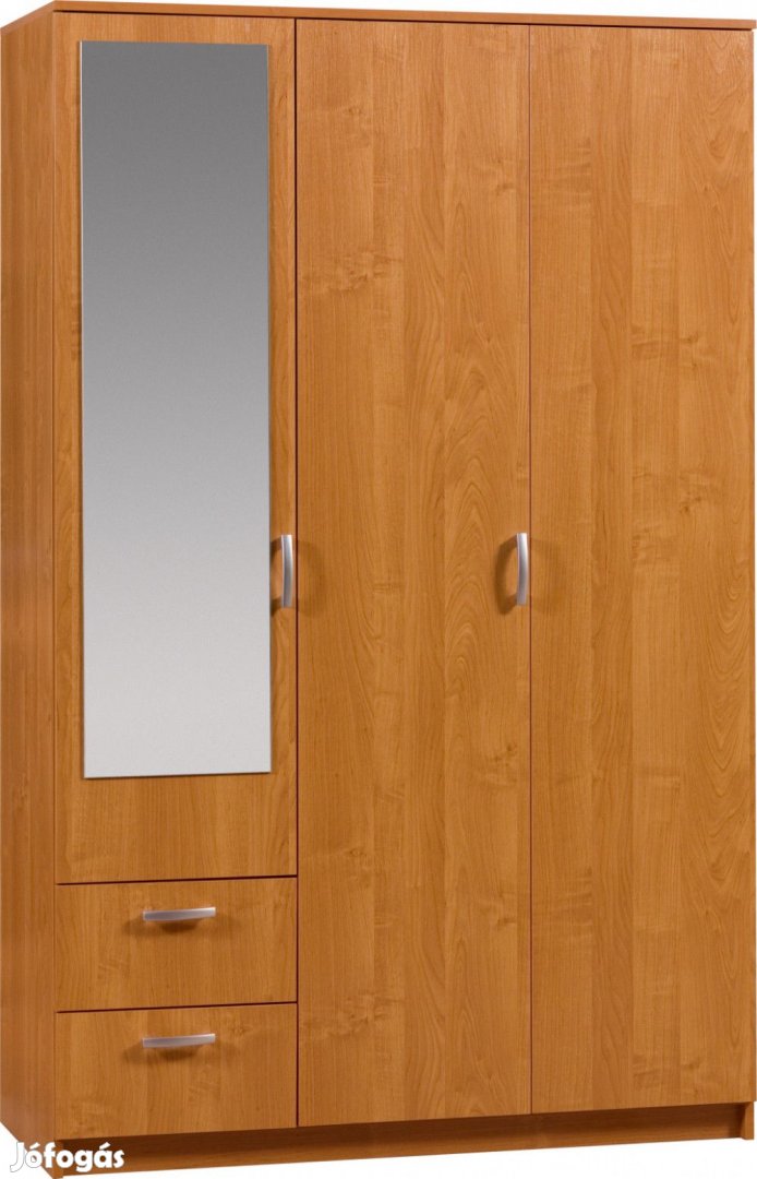 Gardróbszekrény 3 ajtóval és 2 fiókkal, 1 ajtó mögött végig polcokkal, 2 ajtó mögött felül 1 polccal és vállfatartó rúddal, tükörrel, éger színben. További információkért kattintson ide: