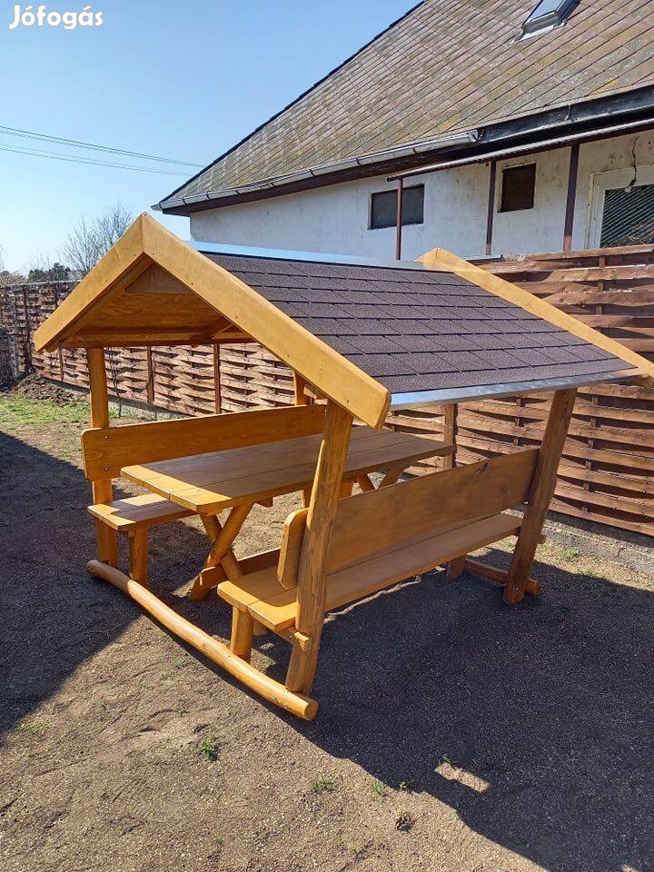 A tető és a padok egybeépítve, az asztal külön mozgatható.