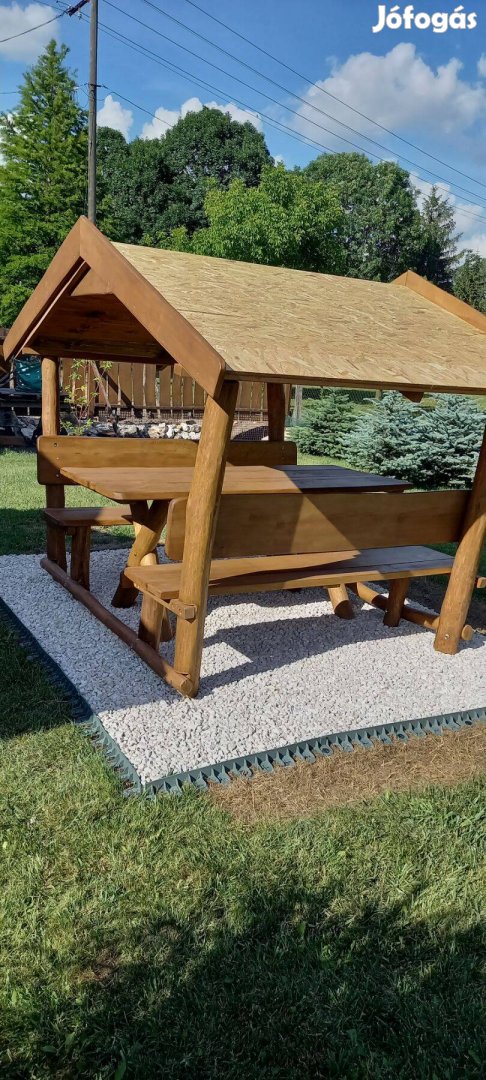 A tető és a padok egybeépítve, az asztal külön mozgatható.