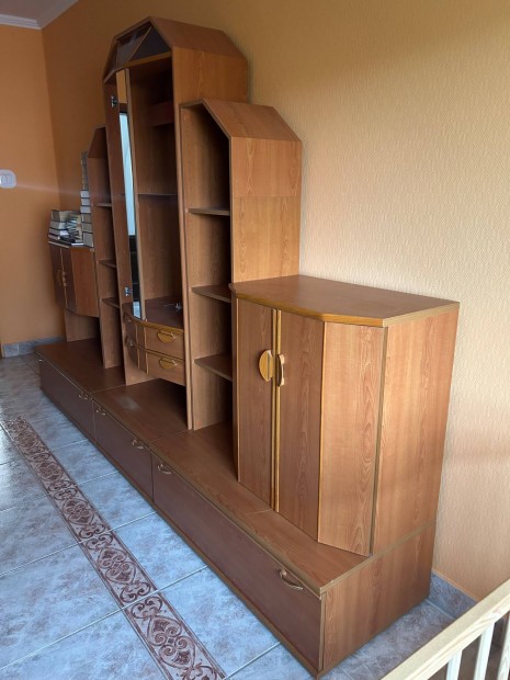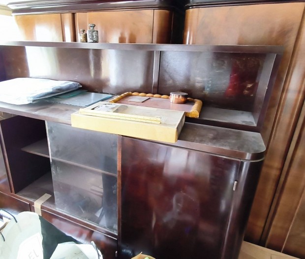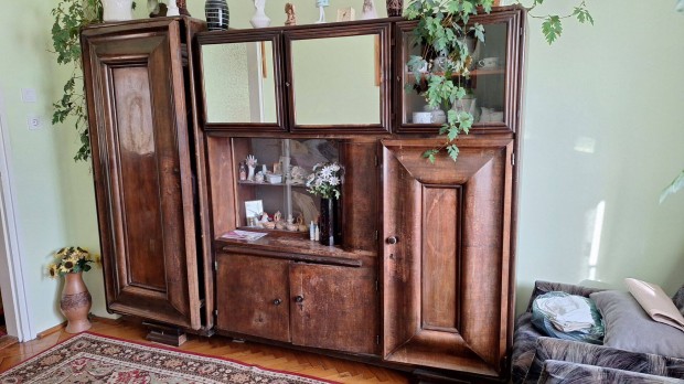 Kb. 100-éves, valódi fa szekrény, akasztós, polcos, vitrines résszel