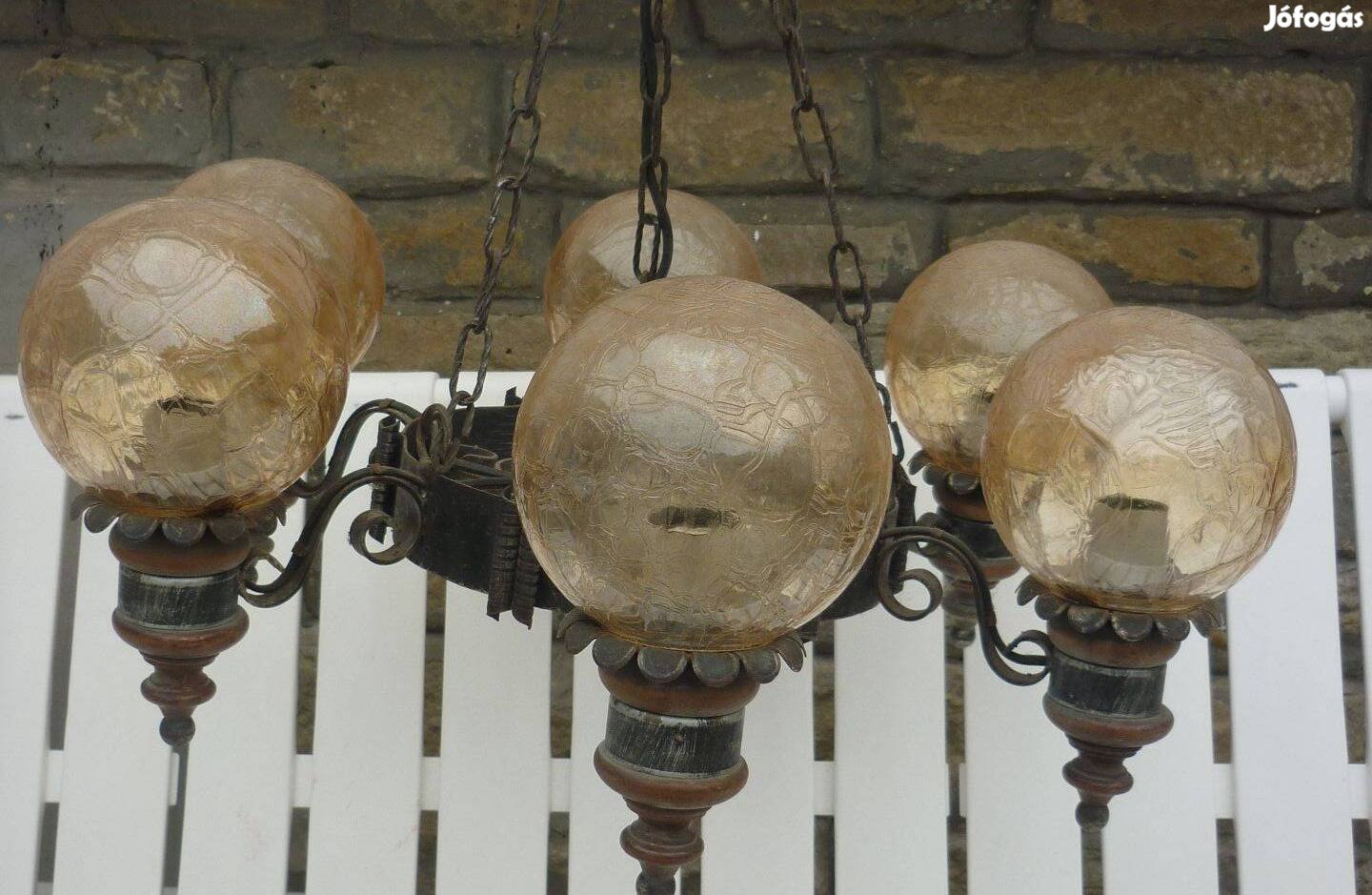 Megkímélt állapotú 6 üvegburás kovácsoltvas, és fa anyagú antikolt csillár eladó. E 27 foglalatokkal van szerelve.