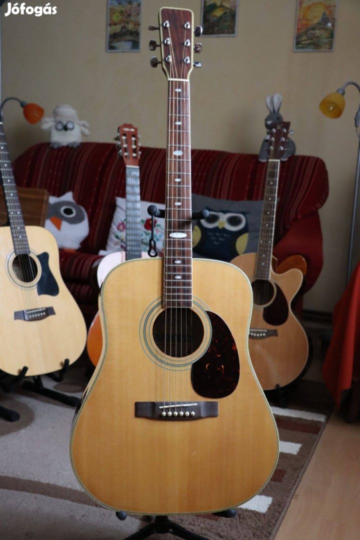 Eladó egy AMT SJ 93 akusztikus gitár, jumbo testtel. Ez a modell az AMT kínálatának komolyabb darabja: szép kidolgozás, díszített hátlap, meglepően telt hangzás. A test hátlapja háromrészes, középen világos csíkkal és díszítő berakással.