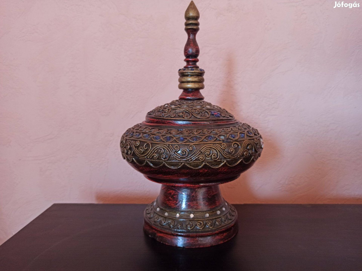 Eladó egy antik, lakkozott fa áldozati tál, amely valószínűleg Burmából vagy Mianmarból származik, a 20. század közepéről.