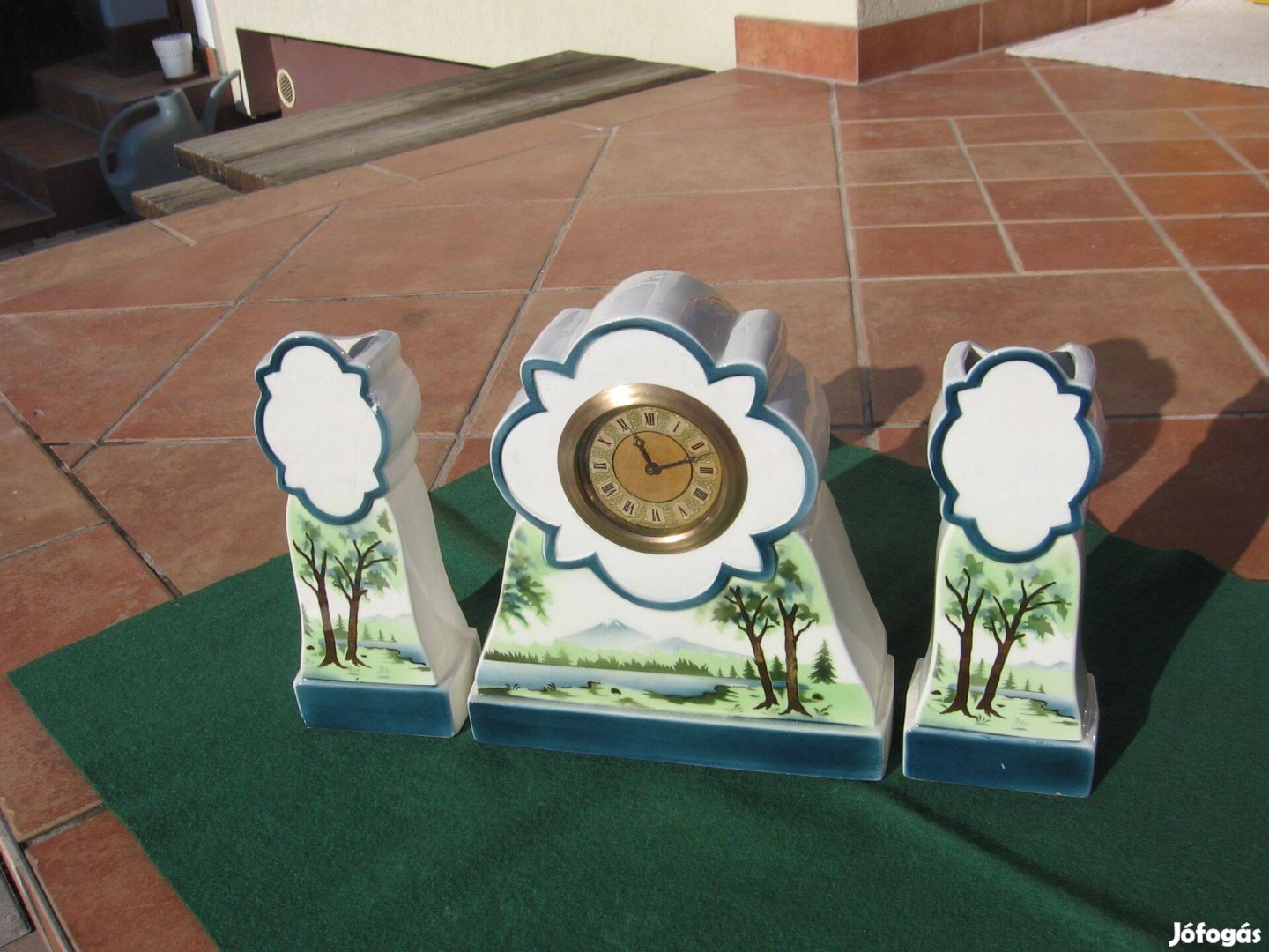 Antik asztali óra kerámia tartószerkezettel és + 2 db. kerámia vázával