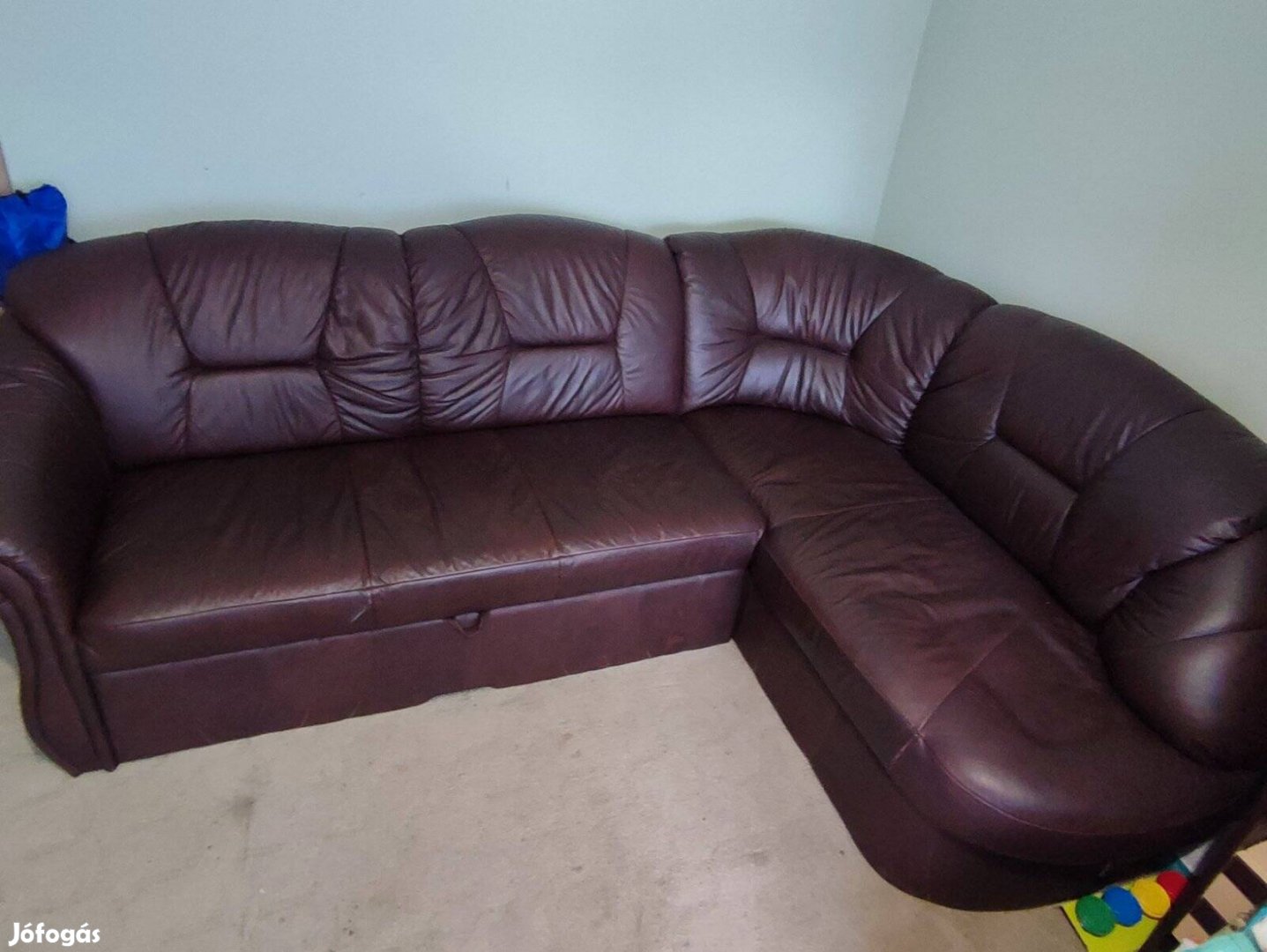 Eladó a képen látható barna bőr kanapé. Ágyneműtartós, kihúzható.