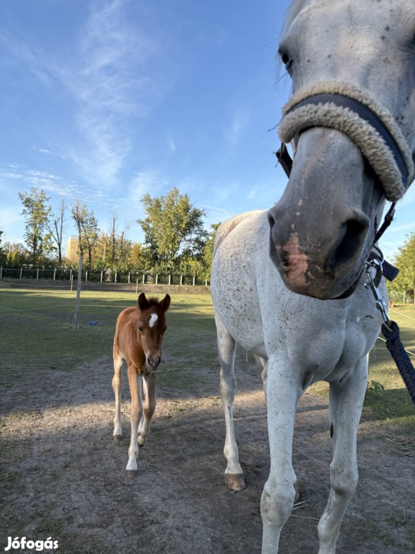 Júliusi születésű mén csikó korának megfelelő tudással köthető vezethető lábait adja ! Apja póni anyja arab tökéletes választás lehet pónigaloppra vagy sport célokra ! Apja 130 cm anyja 155cm várható magassága valahogy a kettő között lesz ! 550 ezer Ft irányár a ló mellet kicsit alkuképes ! Érdeklődni telefonon