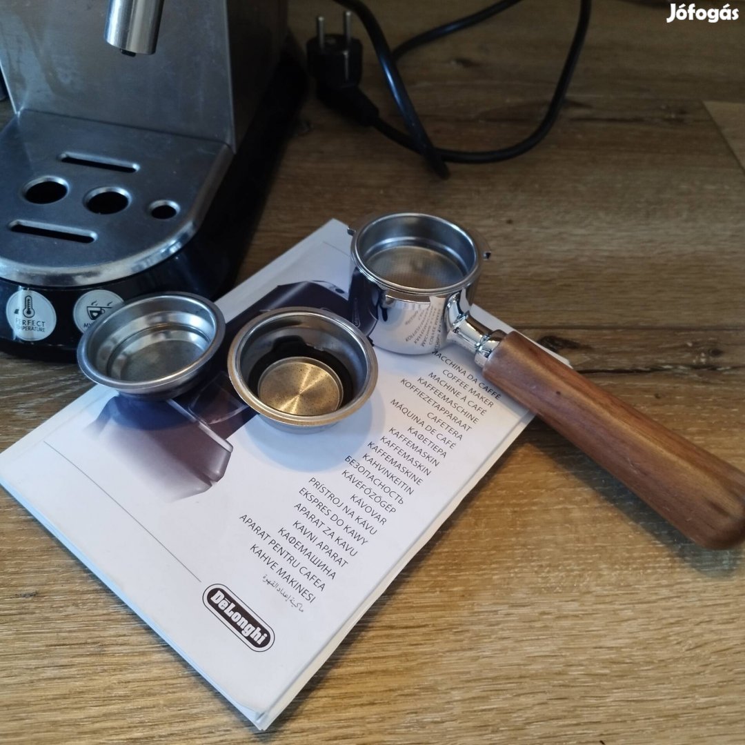 Tartozék 1, 2 személyes és podos szűrők, valamint az eredeti helyett egy fa nyelű bottomless portafilter.