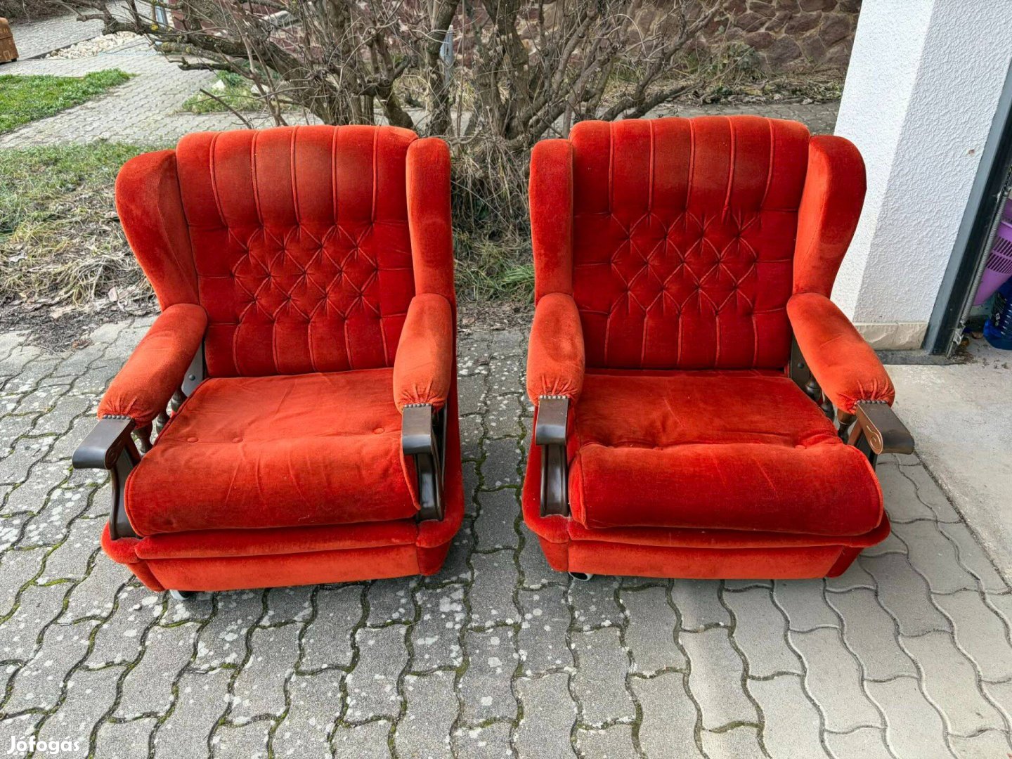 Eladó egy gyönyörű, vörös szövetből készült antik ülőgarnitúra, amely gurulós fotelekből és egy kihúzható kanapéból áll. A szövet szép állapotú, tiszta, nem penészes, azonban ahogy a képen is látható az ülőlapból néhány gomb hiányzik. Összességében egy kisebb felújítás ráfér, de jelenlegi állapotában is esztétikus és jól használható. Az ár a teljes garnitúrára vonatkozik, minimálisan alkuképes. A kihúzható kanapé nincs a képeken, mert szétszerelt állapotában tároljuk, de érdeklődés esetén összeszerelt állapotban megtekinthető.