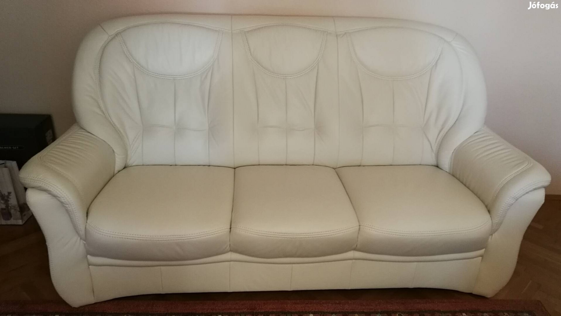 Költözés miatt eladó fehér,bőr Lugano ülőgarnitúra./3+1+1/ .A kanapé használaton kívül,a hátlapja is bőr,nem ágyazható.A fotelek megkímélt állapotúak.