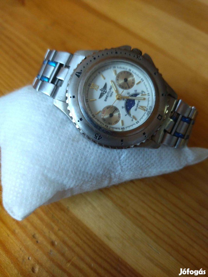 Kvarc szerkezetű férfi karóra. Dátum-, napkijelzés és holdfázis funkcióval,forgatható lünetta.