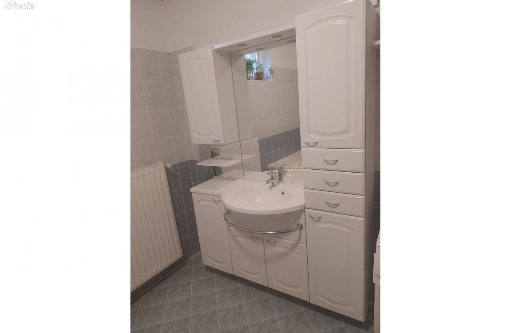 Eladó a képeken látható használt fürdőszoba bútor mosdóval, csapteleppel. Irányár 55 000 Ft