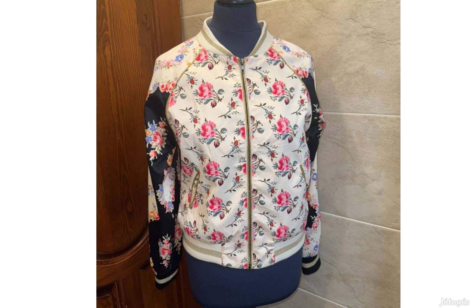 Gucci virágmintás selyem bomberdzseki, amely az Alessandro Michele korszakából származó Guccification kollekció része. A dzsekit jellegzetes rózsaszín rózsaminta díszíti, ujjai kontrasztos sötét alapszínűek, a hátoldalán pedig flitteres Guccification felirat látható, piros hímzéssel. Bordázott, csíkos kötött szegélyek a nyaknál, a mandzsettáknál és a derékrészen.