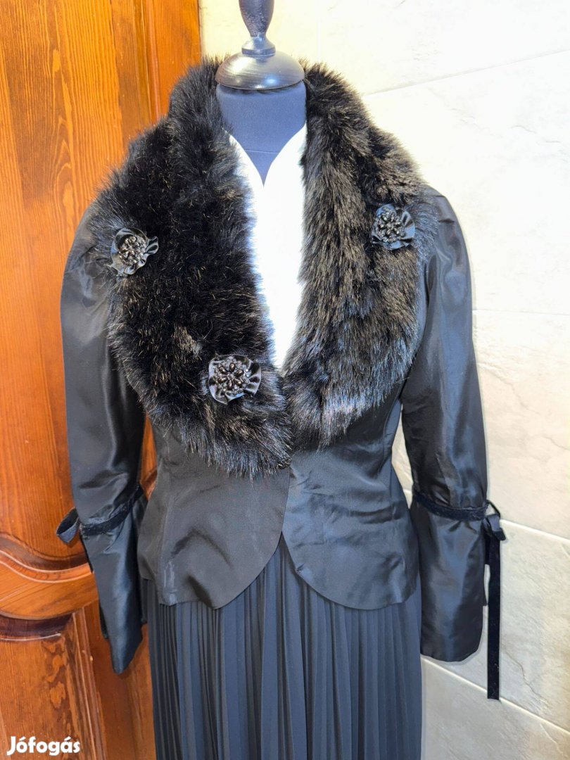 Gyönyörű, hibátlan állapotú darab, melyet sok évvel ezelőtt vásároltam és csak pár alkalommal viseltem. Azóta a gardróbszekrény megbecsült tagja, így kihasználatlanság miatt válnék meg tőle. Azt hiszem, a fotók visszaadják az újszerű állapotot. Fekete kabátka, melynek ujjai fel vannak vágva és mindkét ujja bársony megkötővel van díszítve. Egy gombbal záródik, melyet fotóztam, fekete apró kövekkel foglalva. A műszőrme része is páratlan a fekete köves díszítésnek hála. Hátul pedig, a tarkónál, fekete selyemszalaggal és bársonyszalaggal van dekorálva.