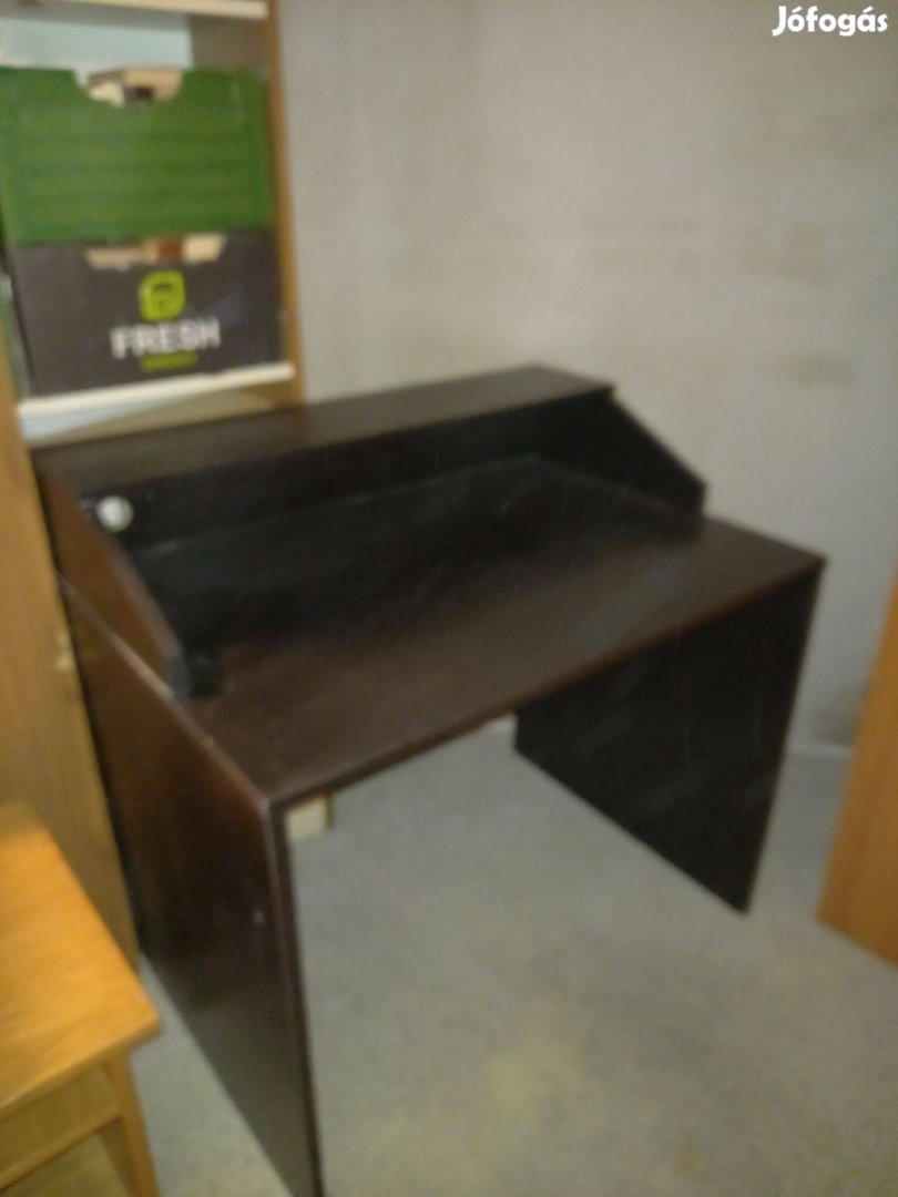 Használt íróasztal eladó. Éjbarna színű, magasított, polcos.