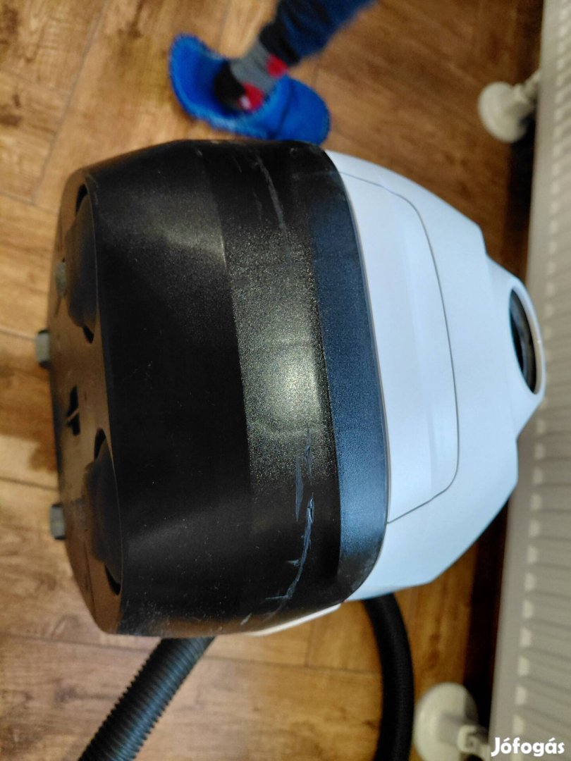 Eladó egy viszonylag keveset használt, szép állapotú porszívó. Erős szívóerejű, porzsák nélküli, vízszűrős rendszerrel működik. Egy víztartályon keresztül megy a levegő, ahol kicsapódik a por, piszok, utána egy motorvédő szűrőn és egy hepa szűrőn keresztül távozik. Ez elvileg 99,95 százalékban megszűri a port. Ezért allergiásoknak kitűnő, vagy akinek fontos hogy nagyon tiszta levegőt fújjon ki a porszívó. Minden tartozékával, képeken látható, nagyon tiszta hepa szűrővel. Pár használati nyom látható rajta, fotókon látszik.