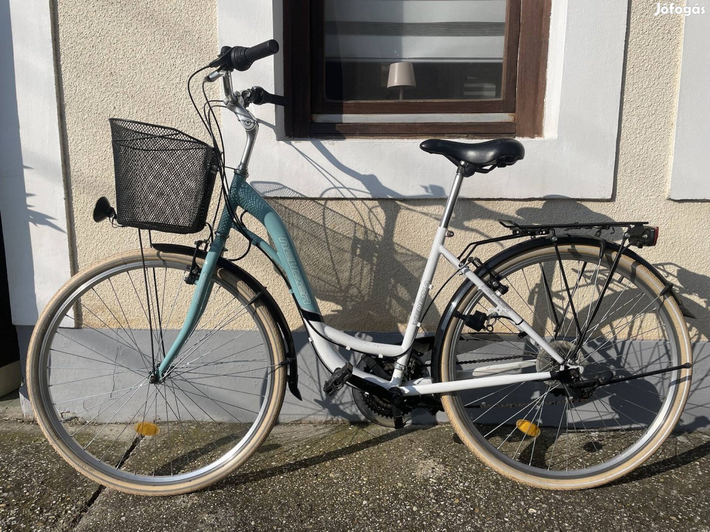 Eladó egy megkímélt városi női kerékpár. Mélyvázas, így könnyű átlépni rajta, 18 sebességes shimano revoshift váltóval, v-fékekkel, dinamós világítással, sárvédő, csomagtartó, elől kosárral, tavaly vásárolt Mitas Flash, krémszínű fényvisszaverős gumikkal. Nem postázom, személyes megtekintés szükséges!