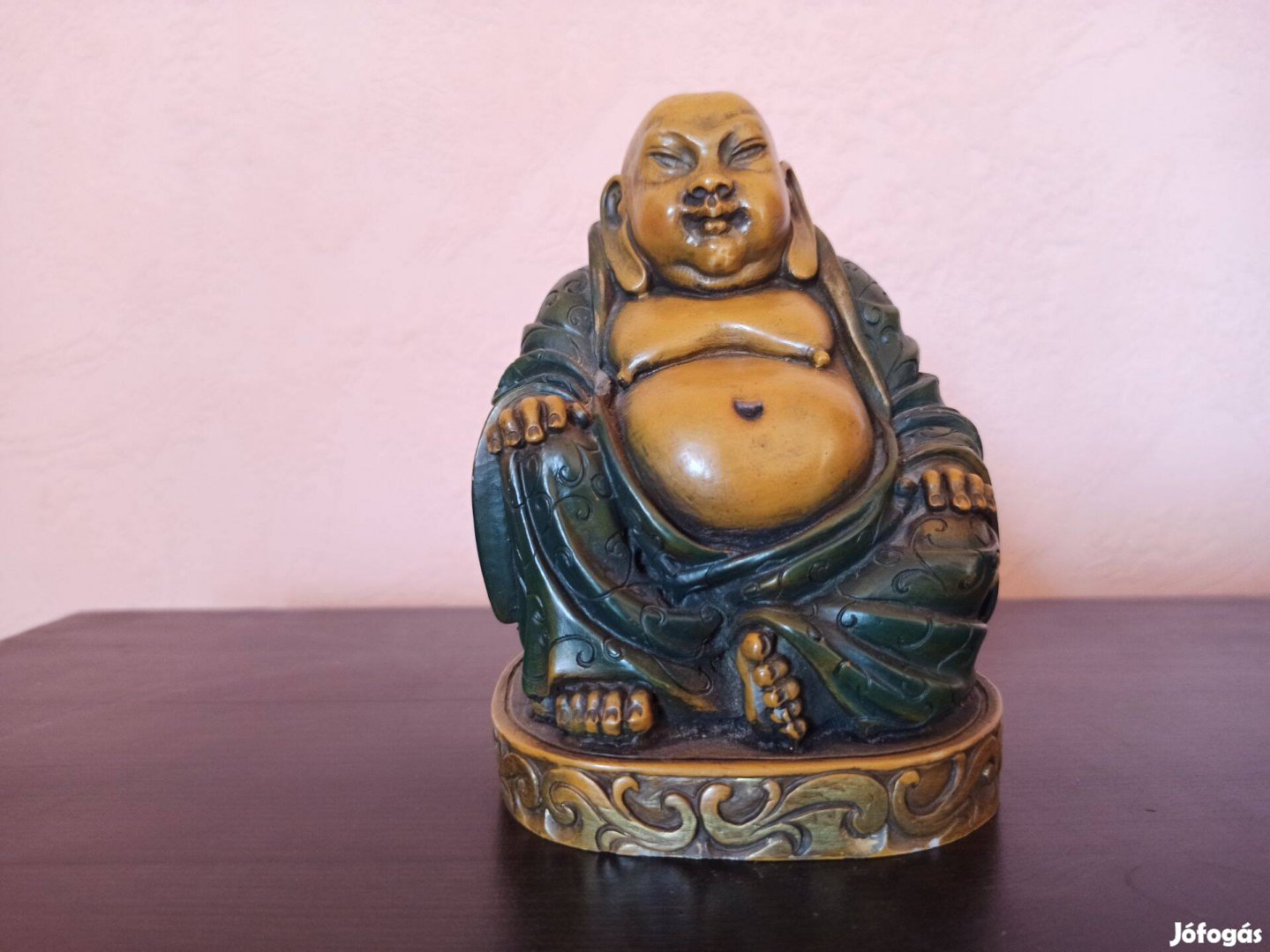 Eladó egy nevető Buddha szobor, amely a boldogság, bőség és jólét szimbóluma a Feng Shui gyakorlatában.