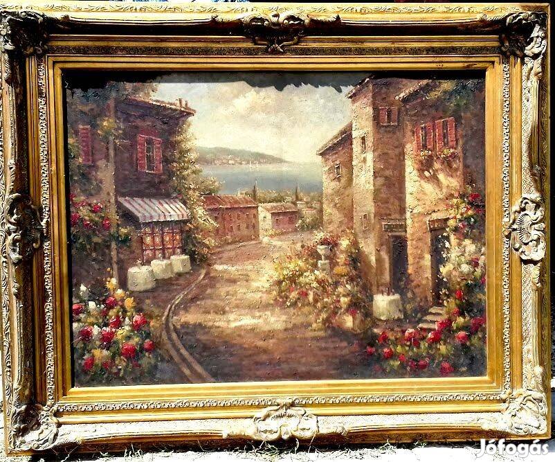 Hagyatékból származó, kúriába, kastélyba, szállodába, vagy nagypolgári lakásba ajánlott, mediterrán témájú, nagy méretű, múlt századi olajfestmény, impozáns aranyozott keretben, Keszthelyen eladó!
